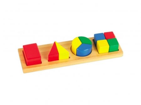 Очень интересная игра. Обработано дерево очень хорошо. Удобные брусочки для детской ручки. Основная цель - вставлять части геометрических фигур в специальные углубления, подсчитать количество частей в каждой фигуре. Игрушка дает начальные понятия о дробях, частях целого. Развивает логическое мышление и моторику руки.