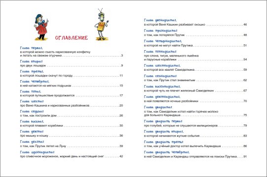 Книга расскажет о приключениях двух маленьких человечков — художнике Карандаше и мастере Самоделкине. Рисунки Карандаша мгновенно оживают, а Самоделкин может смастерить любой, даже самый сложный механизм! Вместе веселые человечки изобретут необыкновенный автомобиль, построят дом, воспитают нарисованного мальчика и одолеют злых разбойников.