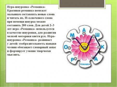 Состав: Игровое поле (150х150 мм, фанера) в виде ромашки, на поле написано слово РОМАШКА, нарисована «звездочка» (заменитель любой буквы) и под каждым знаком закреплена кнопка; цветной шнурок; инструкция.