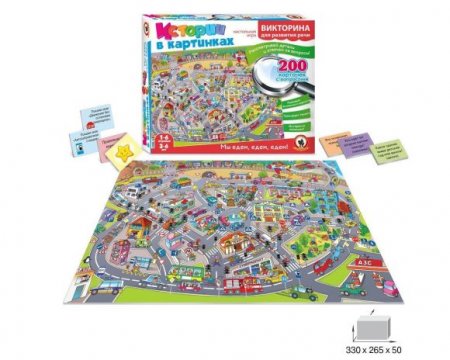 Викторина из серии «Истории в картинках» – это не просто рисунок для развлечения, а увлекательная развивающая игра с простыми правилами, которая поможет малышам получить больше знаний об окружающем мире, городской инфраструктуре, правилах безопасности и дорожных знаках, пополнить словарный запас, развить речь, внимательность, память, навыки порядкового счёта, сравнения чисел и быстроту реакции, научит ориентироваться в пространстве и находить причинно- следственные связи. Игровое поле разглядывать очень интересно, на нем изображен город с множеством улиц, светофоры, дорожные знаки, разнообразные машины, ситуации на дороге и происшествия. В комплекте 200 разноплановых вопросов с ответами для всестороннего развития малышей. В процессе игры взрослый зачитывает вопрос, а малышам необходимо найти на игровом поле нарисованный ответ. Кто быстрее всех нашел правильный ответ, получает призовую карточку со звездочкой. Выигрывает игрок, набравший наибольшее количество звездочек.