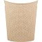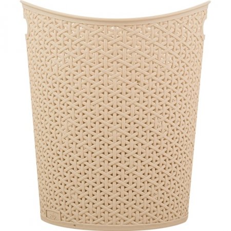 Большой объём корзины, прочный негнущийся пластик. Запаха от пластмассы нет. Красиво смотрится из-за эффекта плетёной корзины. Корзинка устойчивая. Удобно поднимать, т.к. есть две прорезные ручки в корпусе.