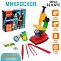 Чтобы эксперименты маленького учёного были познавательными и увлекательными, в комплект входит всё необходимое: микроскоп (увеличение в 300 раз), калейдоскоп, телескоп, 4 слайда, 2 образца клеток, пинцет, нож, лопатка и игла.