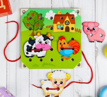 Во время игры малыш будет продевать шнурок сквозь отверстия в игровом поле, а также в фигурках. Покажите, что можно делать стежки, а также завязывать и развязывать узелки.