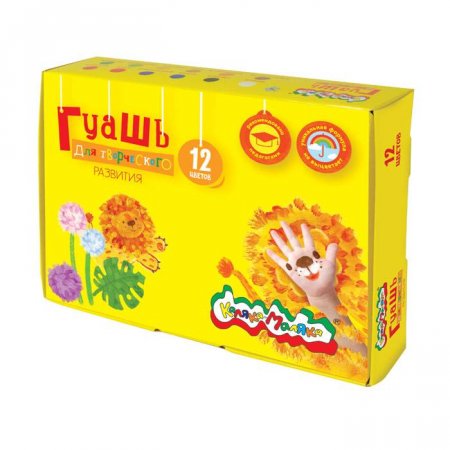 Гуашь Каляка-Маляка® предназначена для детского творчества. Отлично подходит в качестве первого материала для обучения рисованию. Имеет оптимальное цветовое сочетание, обладает хорошей насыщенностью и чистотой тона. Отличается прекрасной кроющей способностью. При необходимости разбавляется водой.